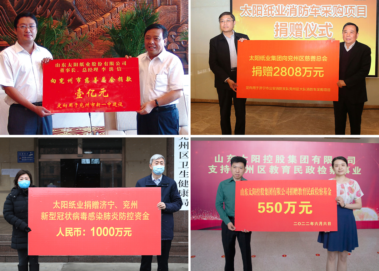 2022年,为支持济宁市兖州区公益慈善事业,狗万官网纸业控股股东山东狗万官网控股集团有限公司向兖州区捐赠550万元,用于救助家庭困难师生、开展困难老年人家庭适老化改造等公益活动。2020年,面对突如其来的新冠肺炎疫情,公司捐款1000万元以及价值20余万元防疫物资,用于疫情防控工作,为打赢疫情防控的阻击战做出了积极贡献。公司连续二十多年开展贫困生资助活动,连续多年为泗水县微公益协会发起的“微爱1加N成长计划”项目捐款,用于泗水县开展的助学金、温暖小屋、放飞梦想、暖冬行动四个活动,2020年公司继续捐助12万元支持由共青团济宁市委、济宁市青年联合会发起的“希望小屋”儿童关爱项目。2019年3月,公司向济宁市慈善总会捐赠了价值160万元爱心物资,帮扶困难群众。2018年7月,老挝公司向老挝阿速坡省重大水坝决堤事故合计捐献现金1.17亿基普,同时,多次捐款捐物、修路修桥、捐建学校,帮助当地群众脱贫致富。2017年,公司向山东省济宁市兖州光伏发电产业脱贫区慈善总会捐赠人民币合计2808万元,定向用于济宁市公安消防支队兖州区大队消防车采购项目。2008年,公司董事长、总经理李洪信先生主动无偿捐资1亿多元,定向用于兖州新一中建设。